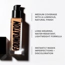 Image 2 - Close-up of a womans face split vertically, showing her bare skin on the left and skin with makeup on the right, demonstrating an improved, more even complexion, with text that reads: BEFORE 355N Medium skin with a neutral golden undertone LUMINOUS. Image 3 - A cosmetic shade matching chart titled FAIR, with columns for LUMINOUS FOUNDATION, IMPECCABLE FOUNDATION, BEAUTY BALM, and MAGIC TOUCH CONCEALER, showing shades 130N, 0CR, 2, 3,4; 140N, 1N, 4, 3,4; 150W, 1CR, 3,4, 3,4; and 160C, 1.5N, 4, 3,4. Image 4 - A light-toned cosmetics shade matching chart displays options for Luminous Foundation, Impeccable Foundation, Beauty Balm, and Magic Touch Concealer, with Luminous Foundation shades including 200W matching 1.5N, 5, 3,4; 210N matching 2N, 5, 3,5; 220N matching 2N, 6,7, 4,5; 230N matching 3CR, 5,7, 5,7; 250C matching 2.5W, 8, 6,8; and 260N matching 4N, 10, 8,9. Image 5 - A grid displaying makeup shade matches for medium skin tones: MEDIUM, LUMINOUS FOUNDATION, IMPECCABLE FOUNDATION, BEAUTY BALM, MAGIC TOUCH CONCEALER, 300C, 4WO, 9, 8, 9, 305N, 3W, 9, 8, 10, 315N, 3W, 10, 8, 10, 320N, 3N, 10, 8, 10, 335W, 4WP, 9, 10, 11, 355N, 4N, 11, 11, 13. Image 6 - A makeup shade chart with the title Tan to Deep, showing Luminous Foundation shades 420C, 480C, 500C, 510W, Impeccable Foundation shades 5W, 6W, 7N, 7N, Beauty Balm shades 12, 13, 14, 14, and Magic Touch Concealer shades 14, 15, 17, 18, 20, 21, 20, 21. Image 7 - A glass bottle of tan foundation with a black pump dispenser and the word FOUNDATION written vertically on its side, next to text that reads: MEDIUM COVERAGE WITH A LUMINOUS, NATURAL FINISH; LONG-WEARING, WATER-RESISTANT, LIGHTWEIGHT FORMULA; INSTANTLY MASKS IMPERFECTIONS + DISCOLORATION. Image 8 - A close-up side profile of a womans face showing healthy, glowing skin, with overlay text that reads: 98% said their discoloration was covered naturally and their skin tone appeared more even. *In a user perception study of 116 women. Image 9 - The image displays two foundation bottles with swatches above a comparison chart, featuring Impeccable Foundation and Luminous Foundation; the Impeccable bottle shows Anastasia Beverly Hills, and its chart lists Formula Type Liquid, Coverage Medium to full, Finish Soft-matte, blurring, skin-like finish, Benefits Blurs, plumps, long-wearing, moisturizing, masks discoloration, Ideal for Natural to glam makeup, Highlighted Ingredients Hyaluronic Acid, Bixa Orellana, Phytoglycogen, while the Luminous bottle shows Foundation, and its chart lists Formula Type Liquid, Coverage Medium, Finish Radiant, natural finish, Benefits Blurs, masks discoloration, long-wearing, Ideal for Luminous, barely-there makeup, Highlighted Ingredients True Color Technology, Vitamin E, Soothing Seaweed Extract.