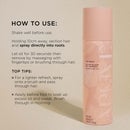 - Application: Shake well before use. For maximum results, hold the can 10cm away and spray directly into roots and brush through the hair to evenly distribute. For a lighter refresh, spray directly onto a brush and pass through the hair.