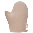 A soft velvet tanning mitt with a thumb grip and slightly larger shape, designed to support smooth, controlled application.
