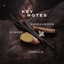 Creamy top notes of vanilla open the scent, lending a sweet, subtle woodiness. At the heart, ginger unfurls with a lively complexity that feels zesty, earthy, and delicately sweet. This is anchored by a base of sandalwood, bringing a soft, floral warmth to the composition.