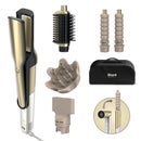 Featuring innovative heat-controlled ceramic plates and powerful airflow, this all-in-one system creates smooth, silky finishes, glossy blowouts and high-shine styles. The kit allowed you to go from wet to styled with minimal effort and reduced risk of breakage.