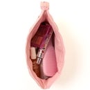 Decorated with pink hearts, the cushioned pouch measures 29cm in length, comfortably fitting brushes, palettes, and skincare staples. Its shallow depth makes every product easy to see and access, simplifying your getting-ready routine at home or on the go.